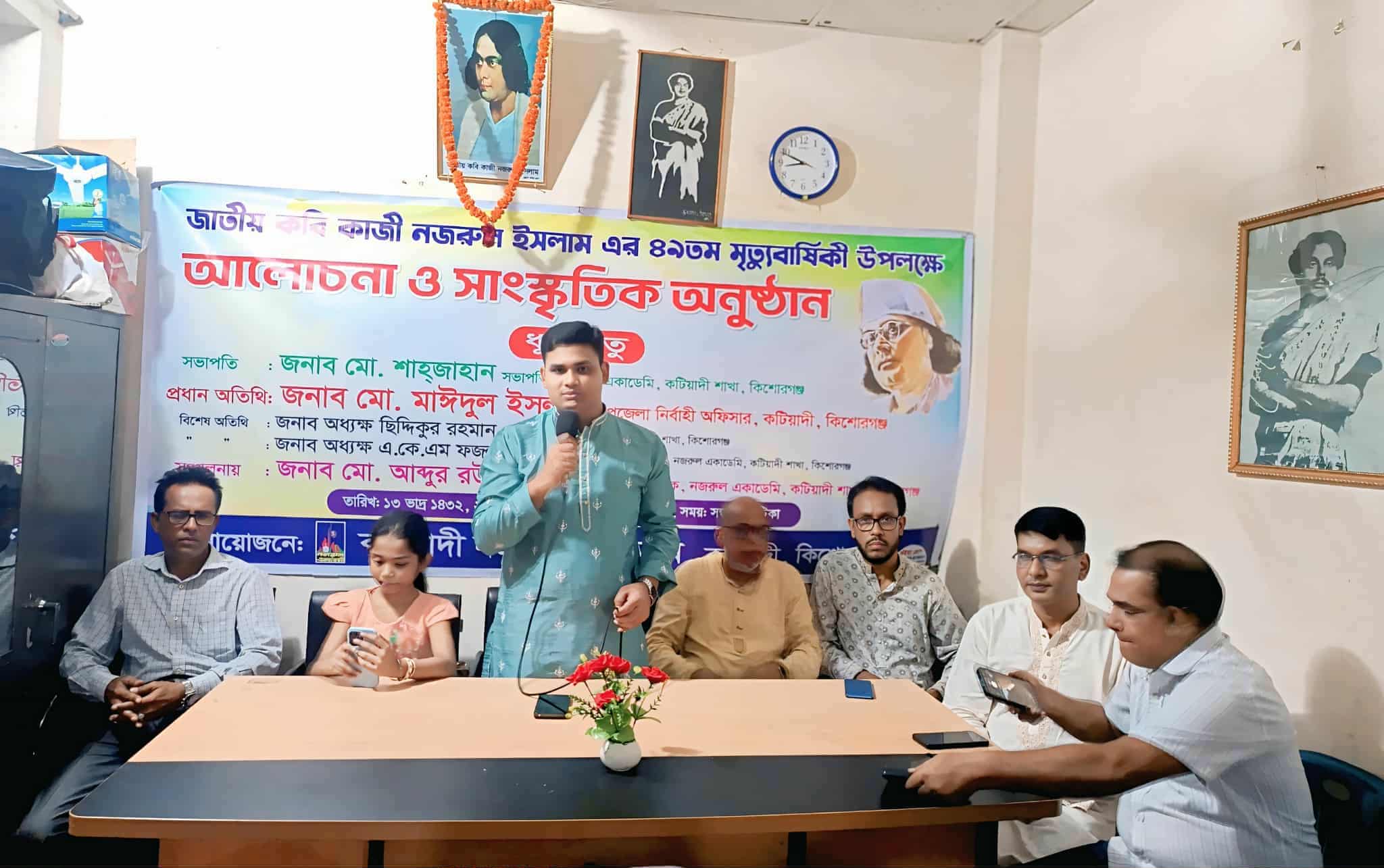 ২৮ আগস্ট বৃহস্পতিবার সন্ধায় এ উপলক্ষে কটিয়াদী নজরুল একাডেমির কার্যালয়ে আলোচনা সভা ও সাংস্কৃতিক অনুষ্ঠান অনুষ্ঠিত হয়। কটিয়াদী নজরুল একাডেমির সভাপতি মোঃ শাহজাহানের সভাপতিত্বে প্রধান অতিথি ছিলেন উপজেলা নির্বাহী কর্মকর্তা মোঃ মাঈদুল ইসলাম।