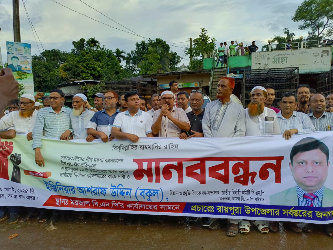 আজ শুক্রবার(২৯আগস্ট) বেলা সাড়ে পাঁচটা থেকে ঘন্টা ব্যাপী উপজেলার মরজাল বাসস্ট্যান্ড এলাকায় ঢাকা-সিলেট মহাসড়কে কয়েক শত শত মানুষ মানববন্ধন, প্রতিবাদ সমাবেশ মহাসড়ক অবরোধ করে বিক্ষোভ মিছিল করে। বিক্ষোভকারীরা “রায়পুরা ভাঙতে দিব না, আসন ভাগ হতে দিব না” নানান স্লোগানে মুখর করে তোলেন মহাসড়ক। তারা হুঁশিয়ারি দেন রায়পুরা থেকে একটি ইউনিয়নও অন্যত্র নেওয়া হলে ঢাকা-সিলেট মহাসড়ক, রেলপথ ও নৌপথ অবরোধসহ কঠোর কর্মসূচি ঘোষণা করা হবে।
